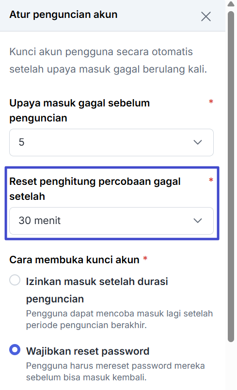Pada opsi Wajibkan reset akun, pengguna perlu mengatur ulang password sebelum masuk kembali ke dalam akun.