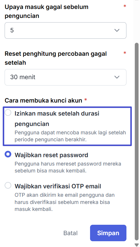 Selanjutnya, pada bagian Cara membuka kunci akun terdapat tiga opsi yang dapat Anda pilih. Pertama Izinkan masuk setelah durasi penguncian, Anda dapat menentukan jumlah durasi (menit) akun akan terkunci sebelum terbuka kembali secara otomatis.