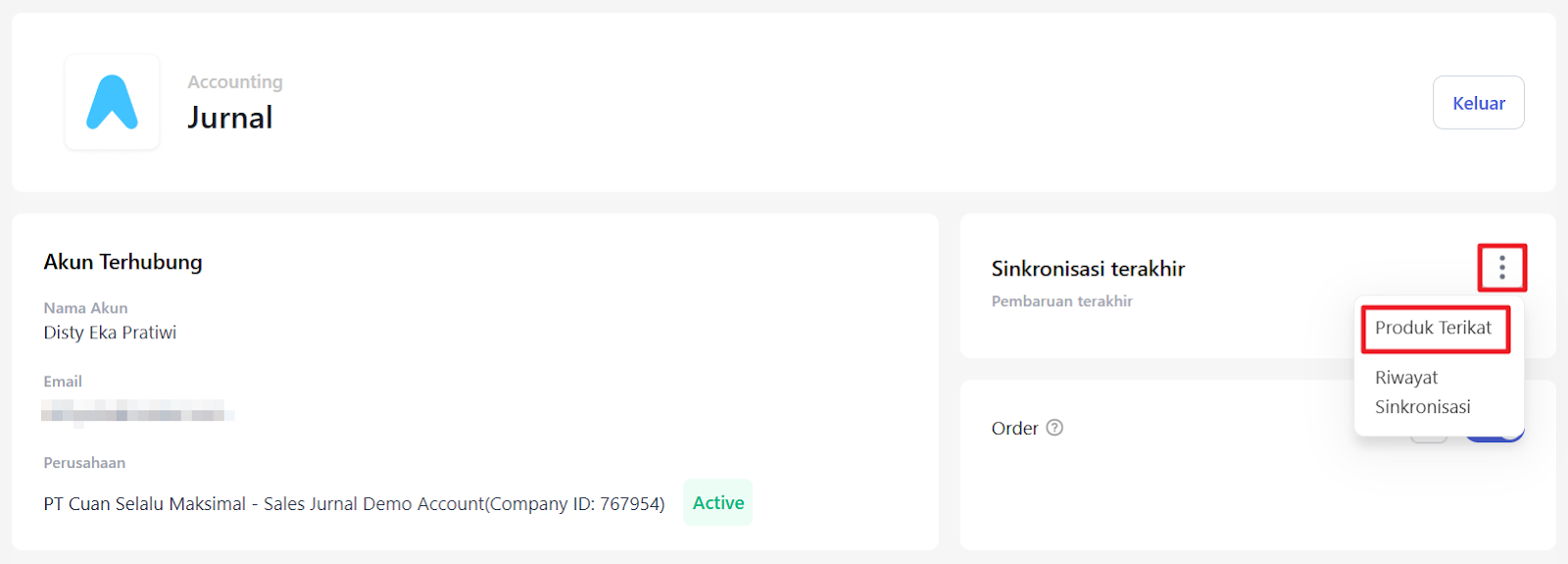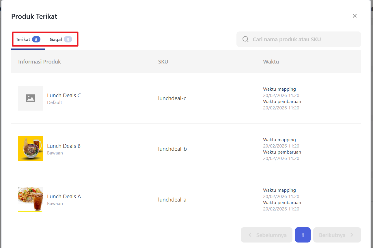 Anda juga dapat melihat produk yang berhasil maupun gagal tersinkronisasi dengan klik ikon “titik tiga” di bagian Sinkronisasi terakhir dan pilih Produk Terikat.