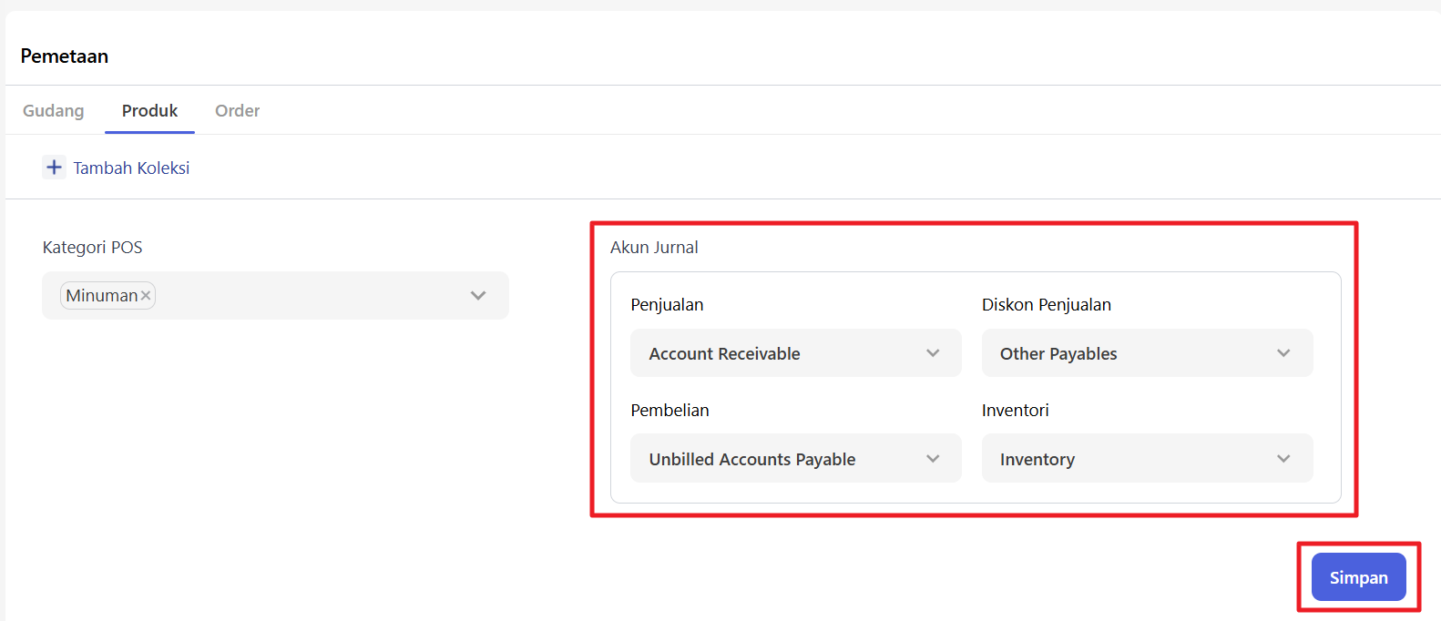 Selanjutnya, atur akun Penjualan dan Pembelian yang ingin digunakan dan klik “Simpan”.
