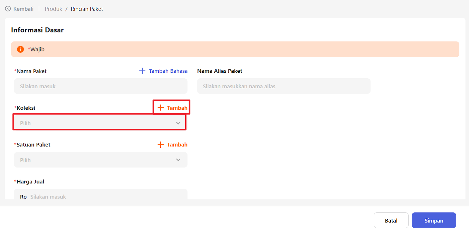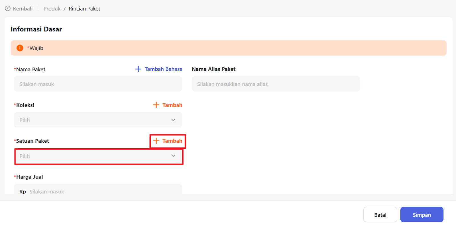 Pilih Satuan Paket yang telah Anda buat atau klik “+Tambah” untuk menambahkan satuan baru.