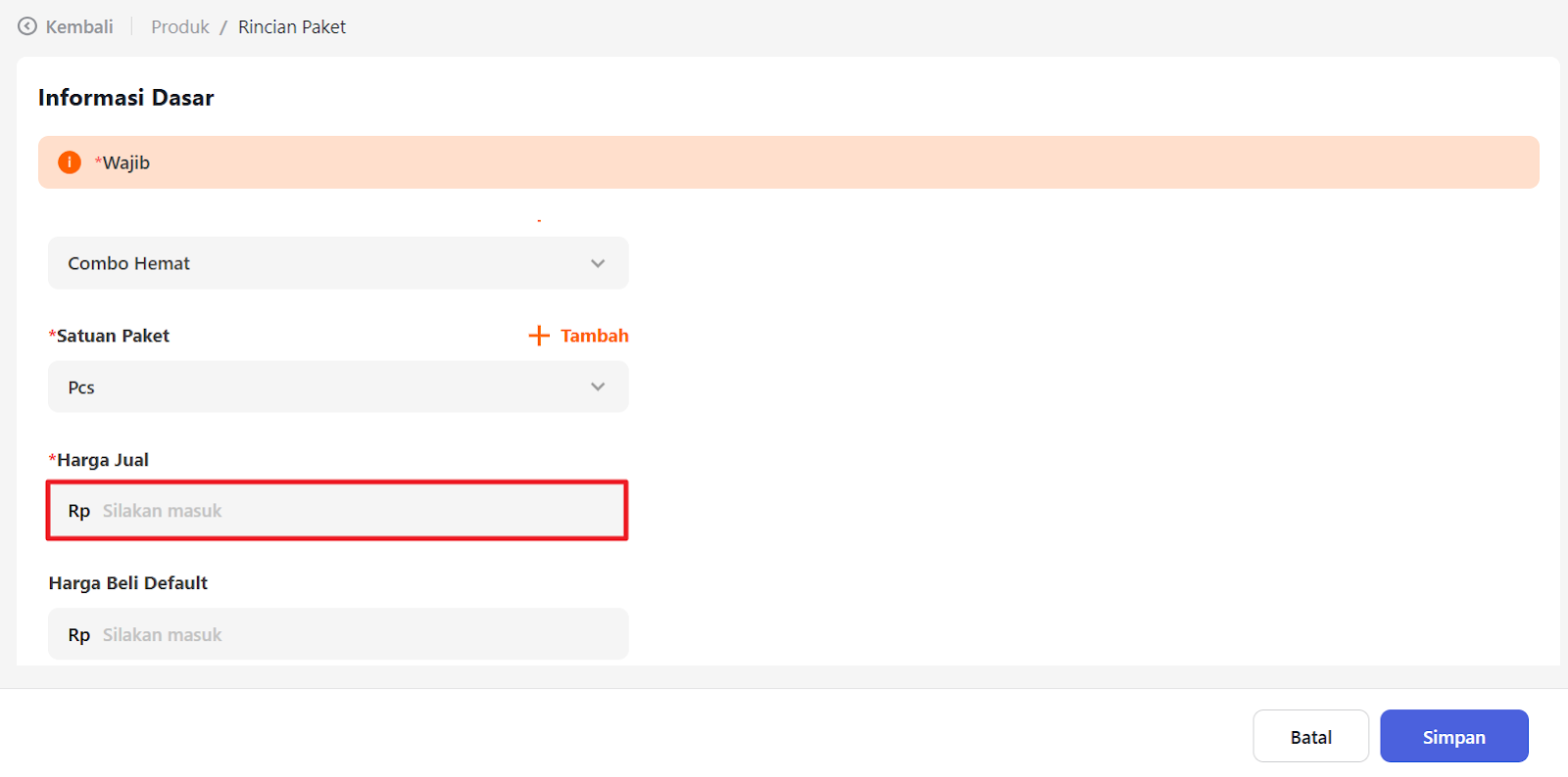 Masukkan harga jual dari paket tersebut.