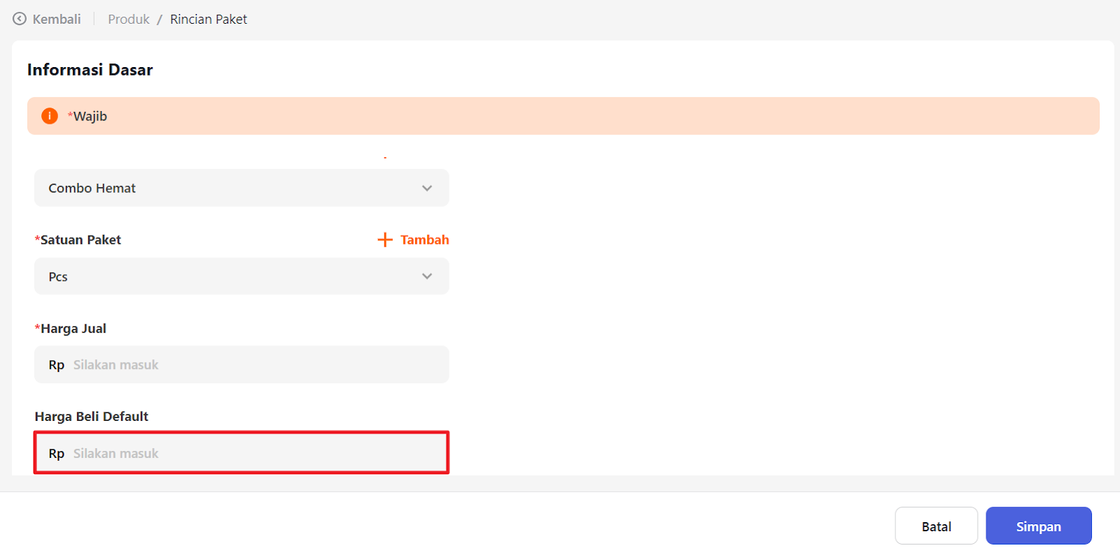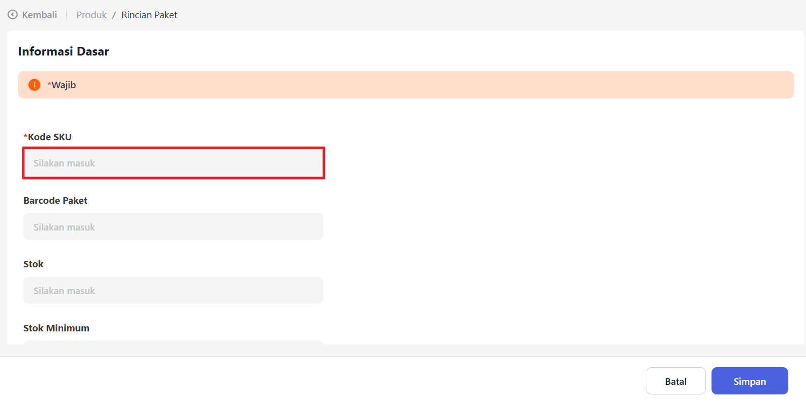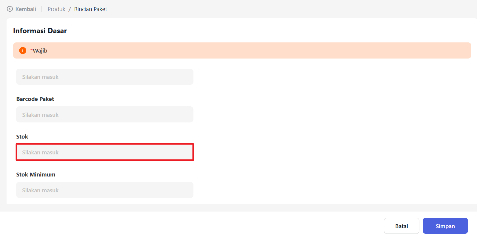 Pada bagian Stok, masukkan stok paket yang tersedia.