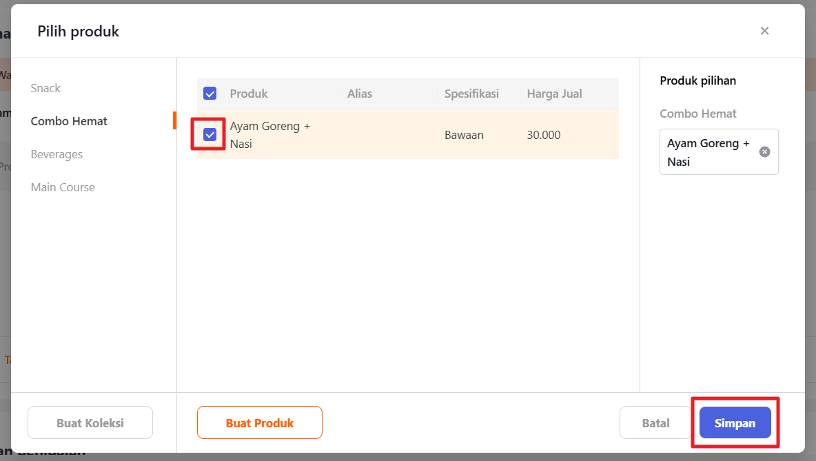 Centang “checkbox” untuk memilih produk yang ingin Anda tambahkan pada paket dan klik “Simpan”.