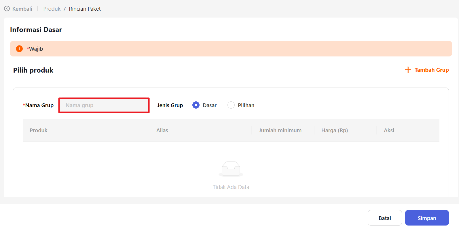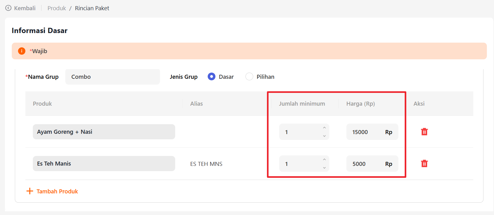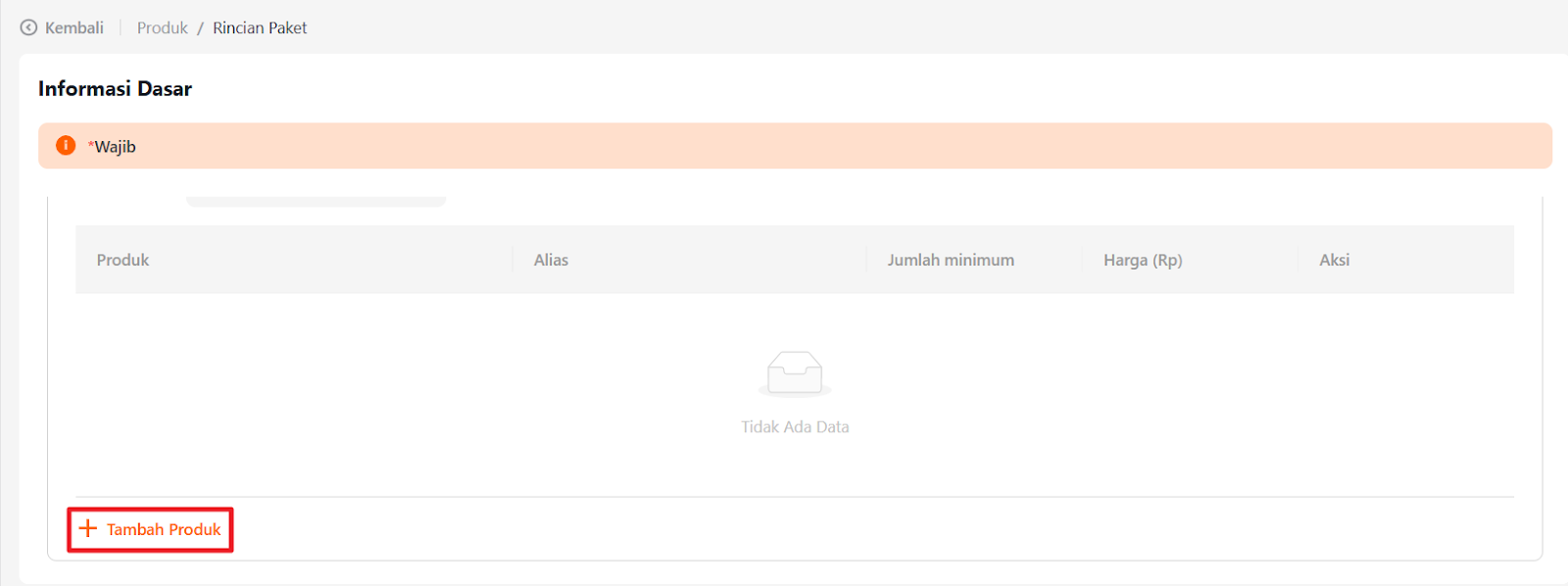 Klik “+Tambah Produk” untuk menambahkan produk pada paket tersebut.