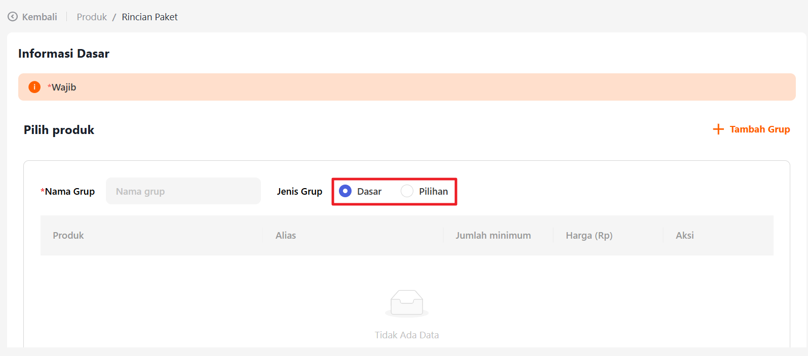 Lalu tentukan jenis grup tersebut, apakah Dasar atau Pilihan.