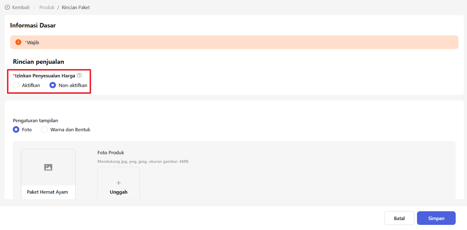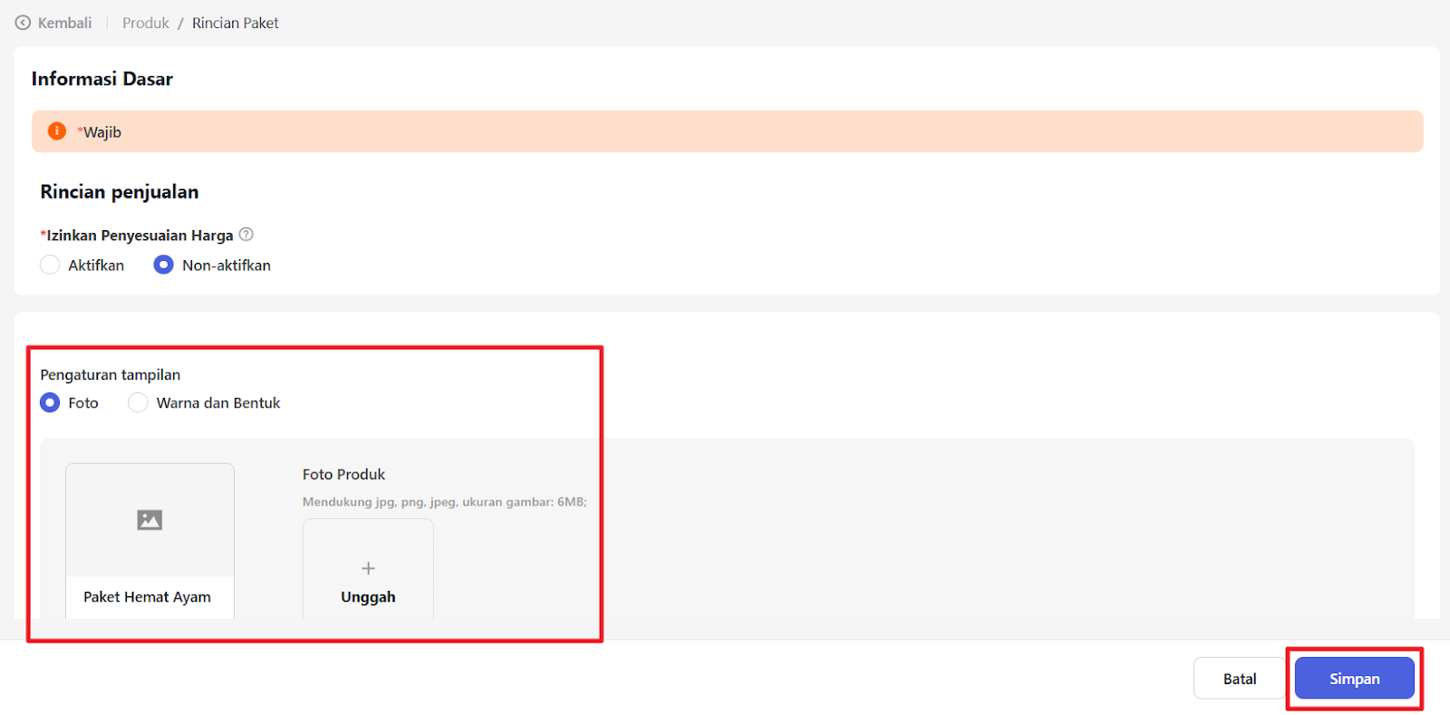 Anda juga dapat memasukkan foto produk jika diperlukan. Dan klik “Simpan” untuk menyimpan produk paket.