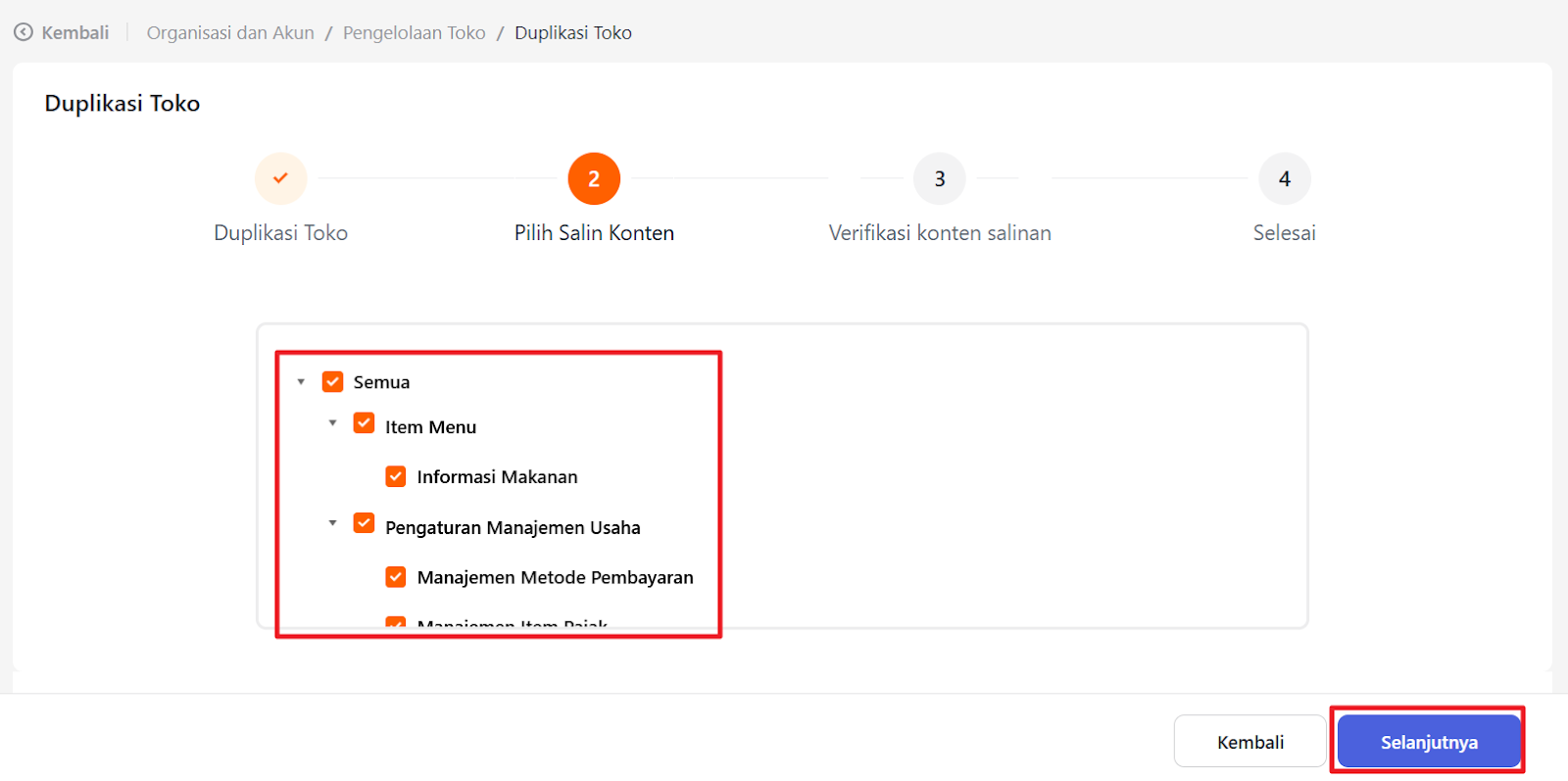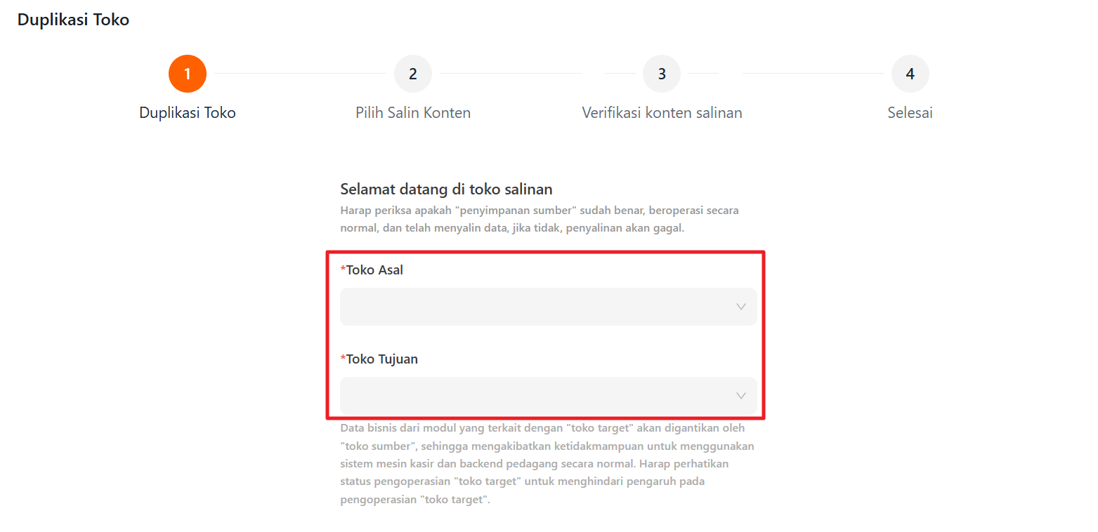 Pilih Toko asal yang ingin diduplikasi, kemudian pilih Toko Tujuan yang ingin memiliki pengaturan yang sama dengan toko cabang terpilih dan klik “Selanjutnya”.