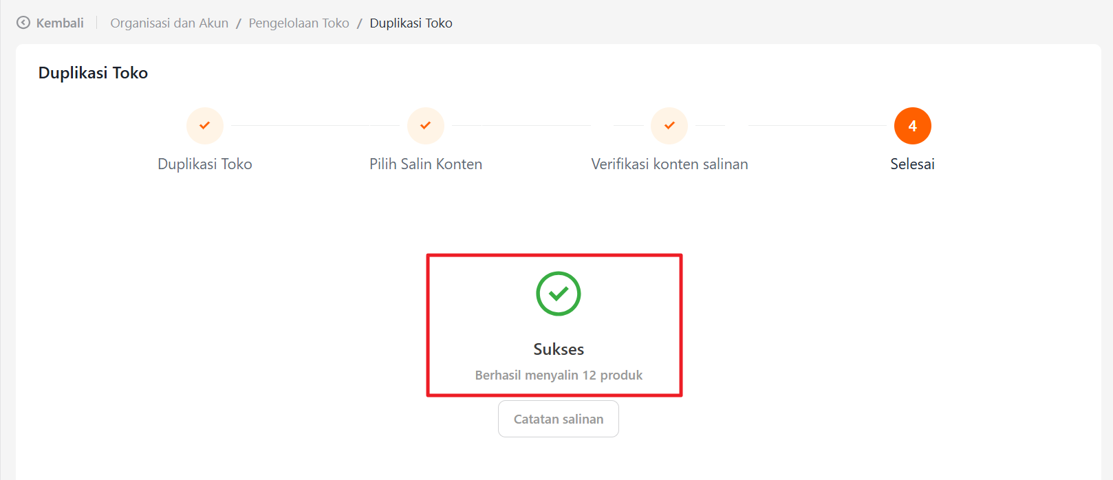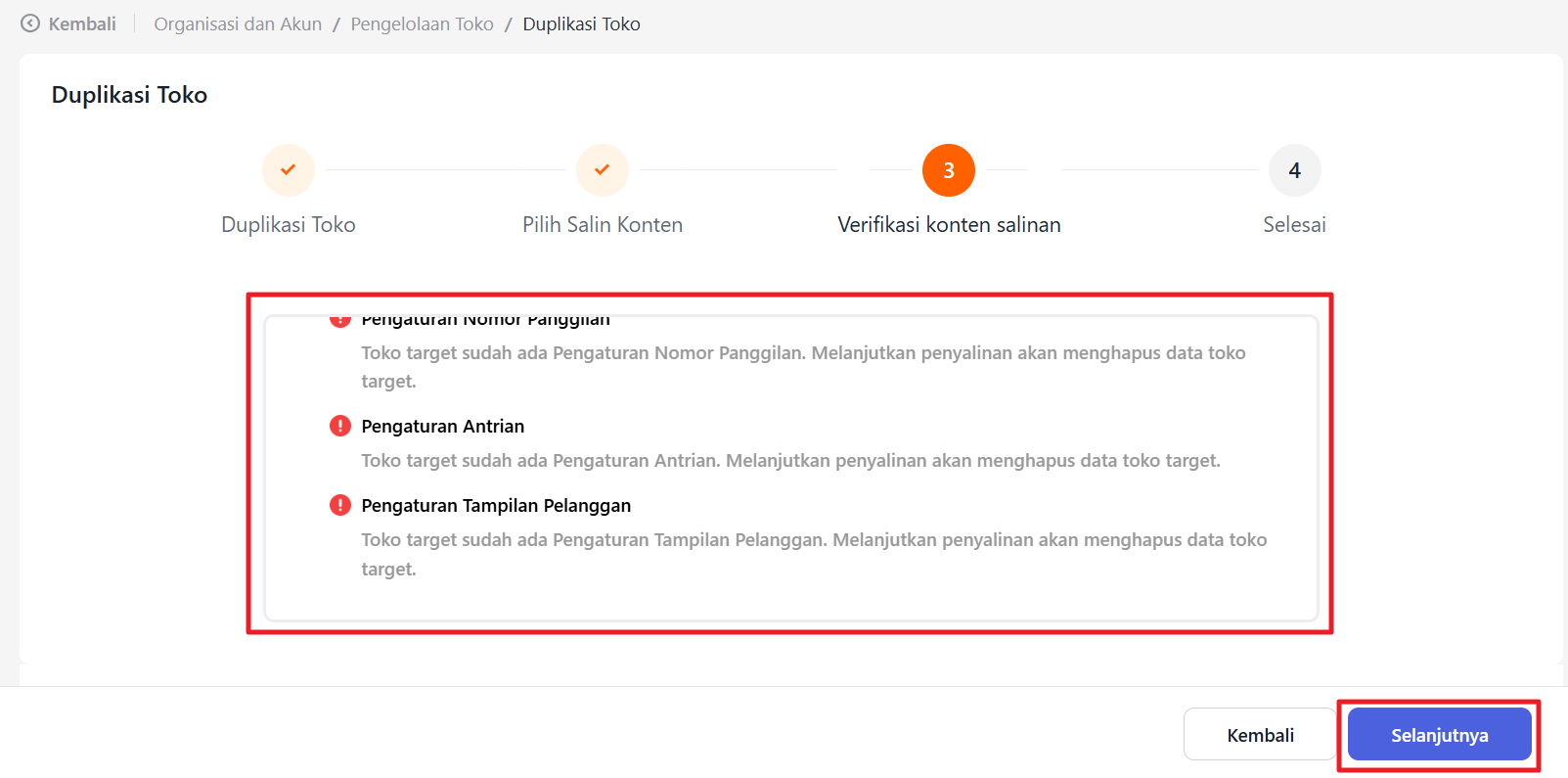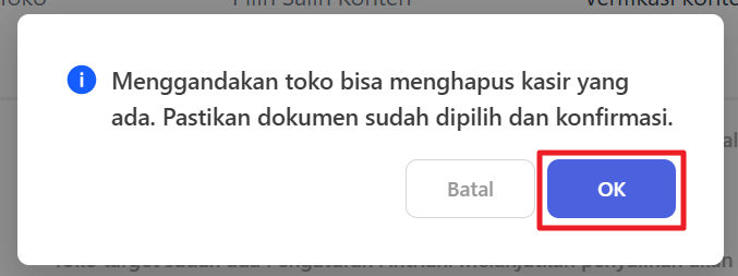 Pilih pengaturan yang ingin diduplikasi dengan mencentang pilihan konfigurasi. Kemudian konfirmasi data yang diduplikasi, dan toko cabang baru akan memiliki pengaturan yang sama dengan toko cabang yang dipilih sebelumnya.