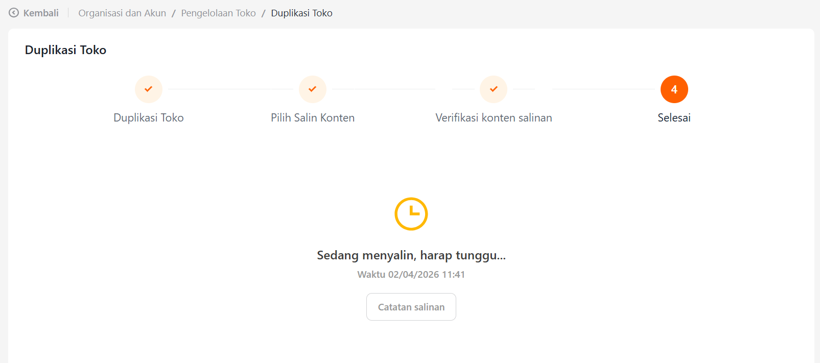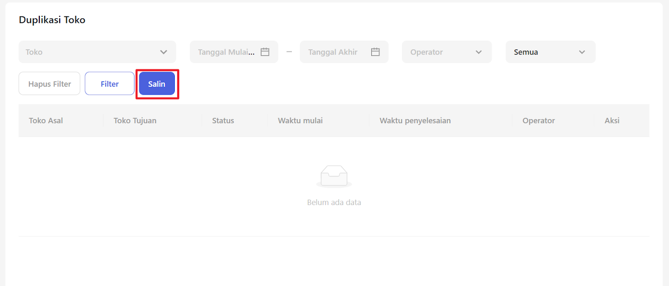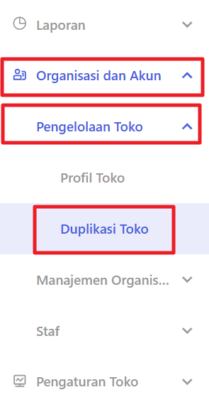 Jika Anda sudah memiliki satu toko cabang, Anda dapat menduplikasi pengaturan toko cabang dengan masuk ke menu Duplikasi Toko pada bagian Pengelolaan Toko di submenu Organisasi dan Akun.