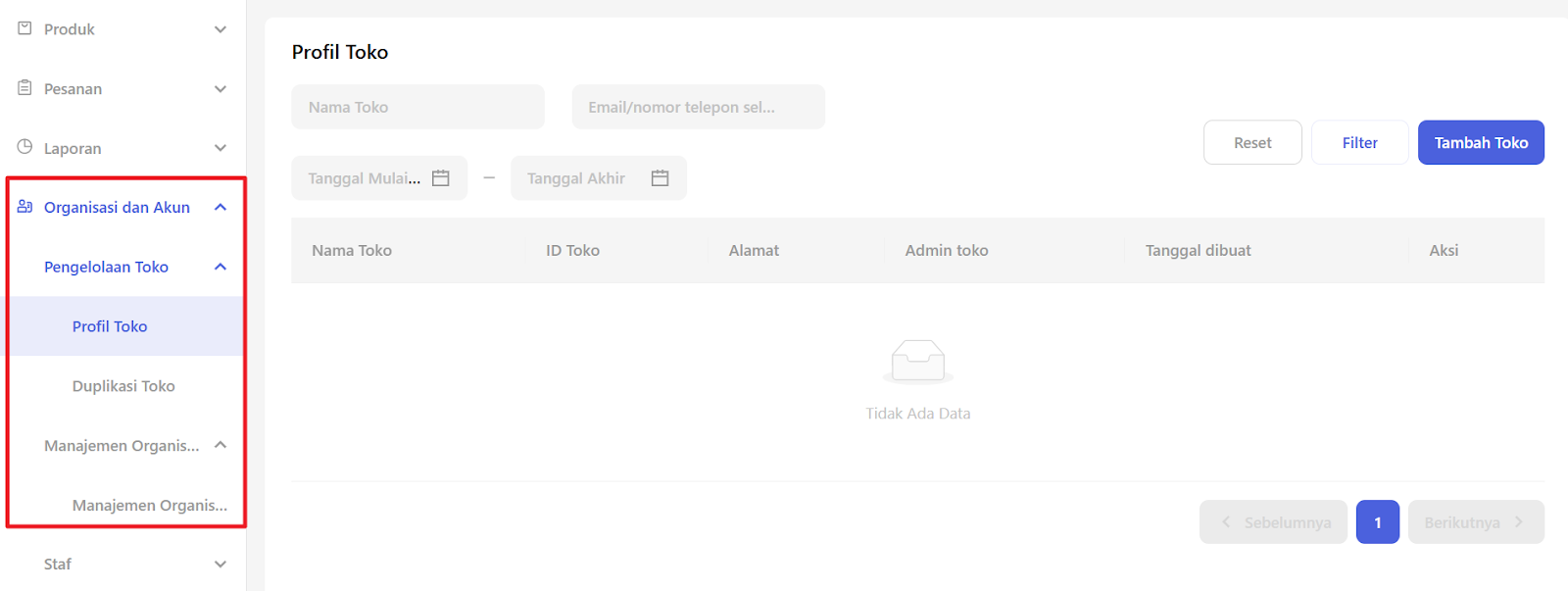 Dan terdapat tambahan menu Organisasi dan Akun yang hanya dapat diakses oleh toko pusat (headquarter).