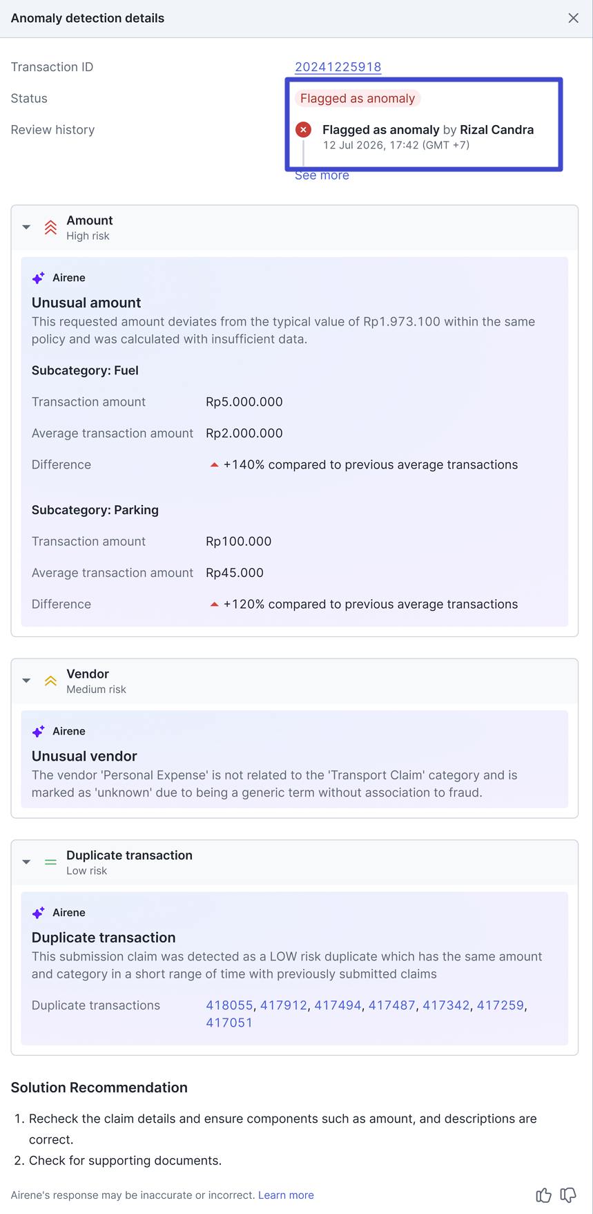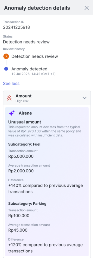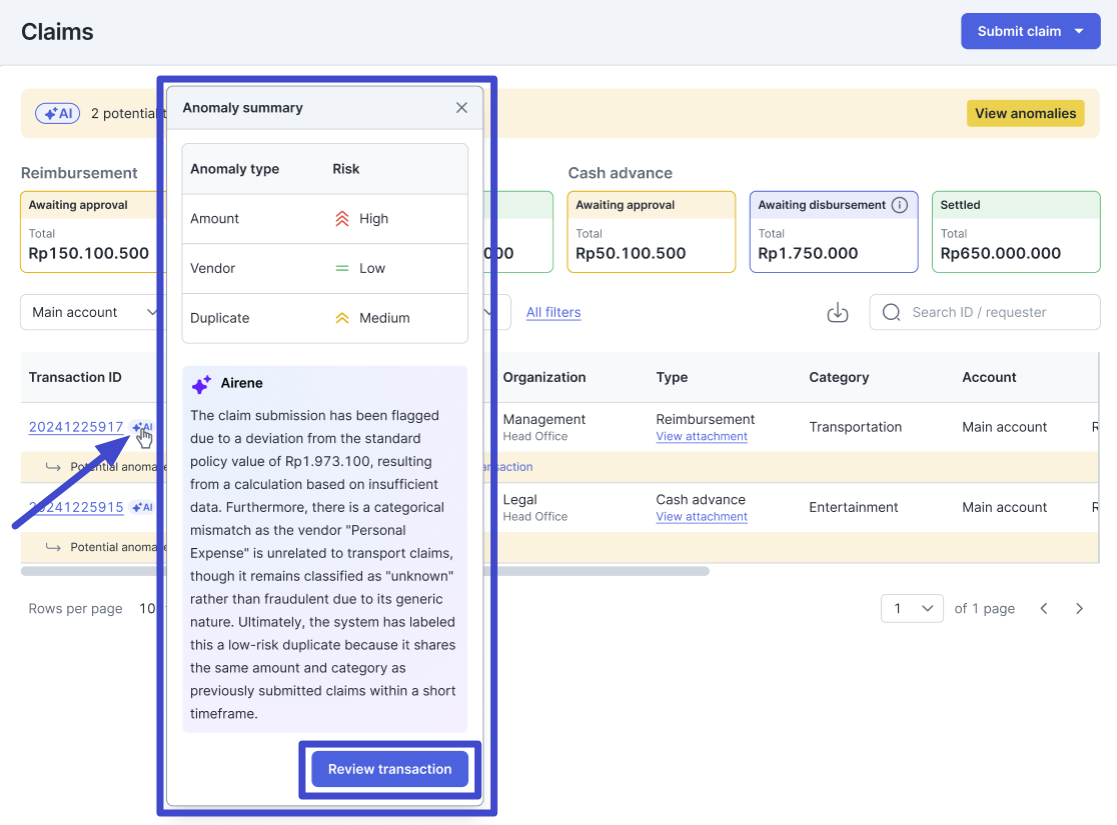 Arahkan kursor ke ikon ‘AI’ pada salah satu transaksi untuk menampilkan ringkasan analisis AI atas transaksi yang terdeteksi anomali. Maka Anda akan langsung melihat Anomaly summary tersebut. Klik “Review transaction” untuk melanjutkan.