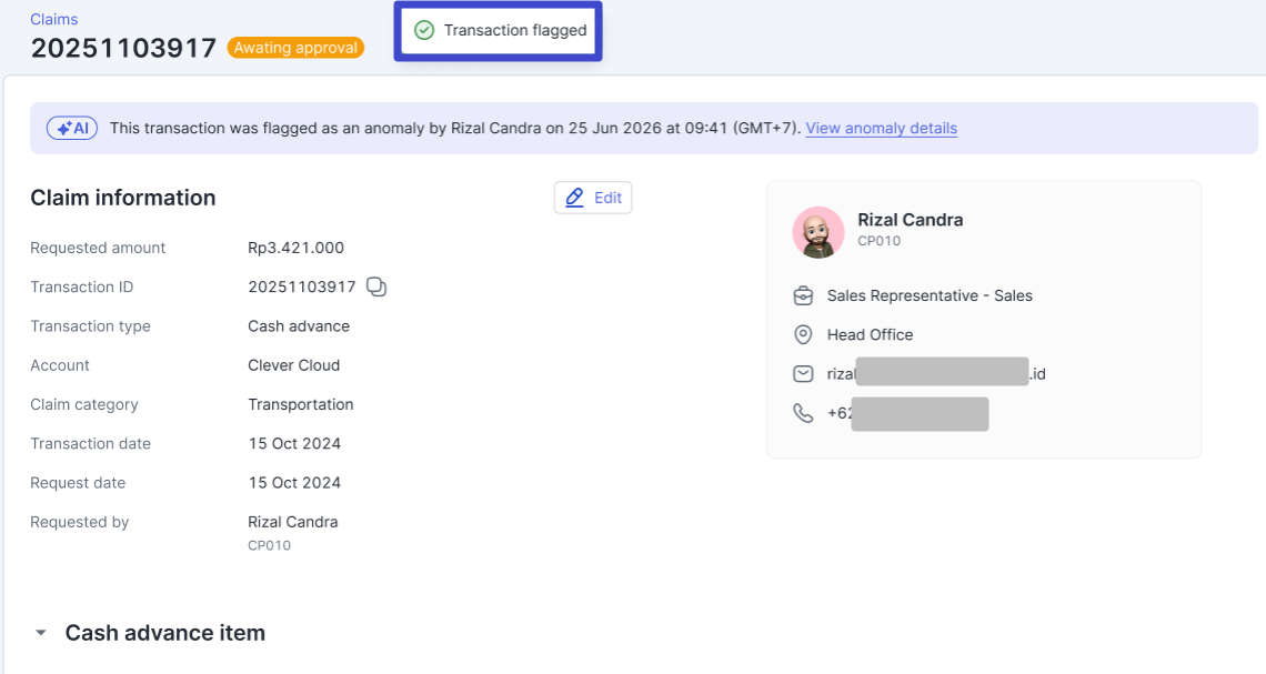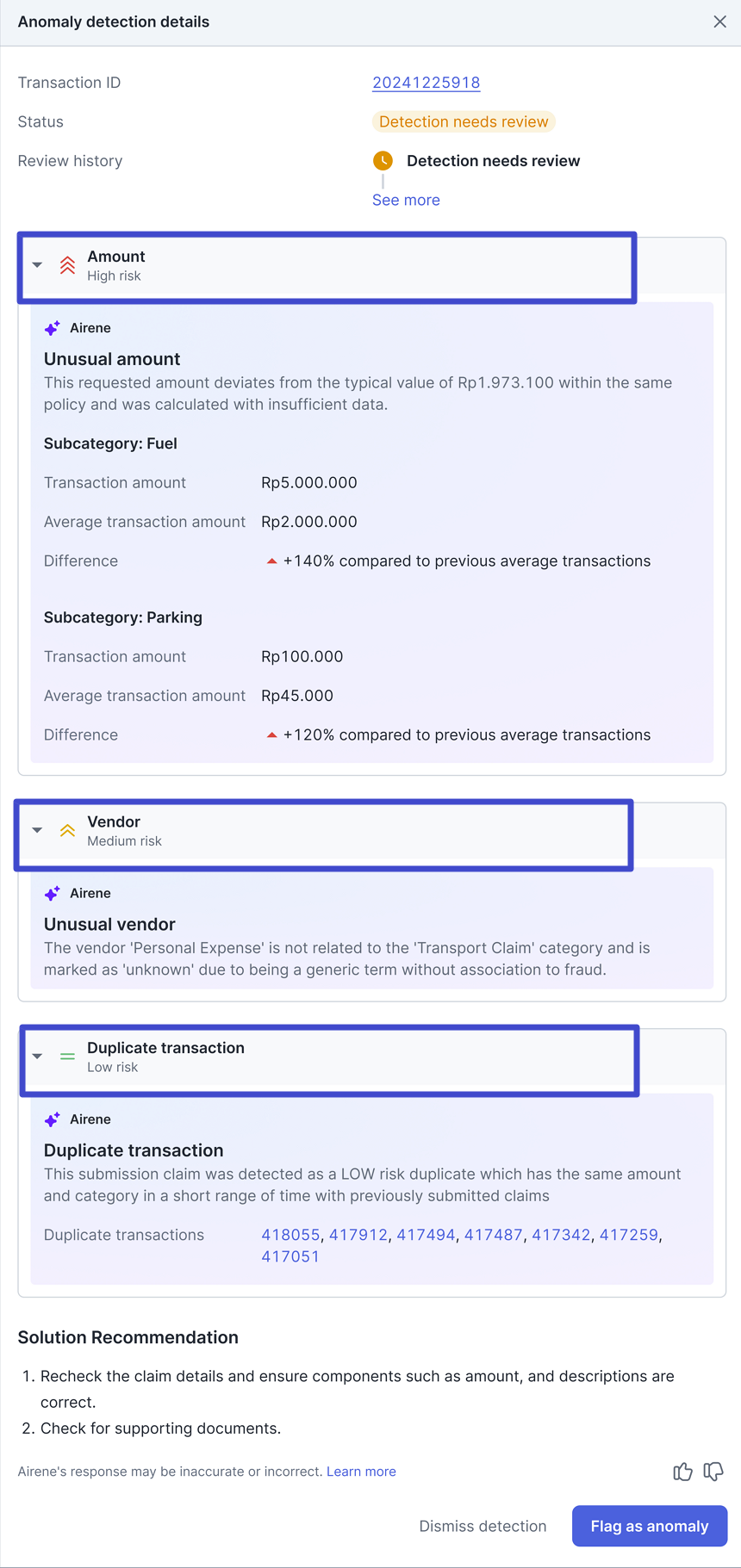 Apabila transaksi tersebut memang terdeteksi sebagai ‘anomali’, Anda dapat klik “Flag as anomaly” untuk tindakan lebih lanjut.