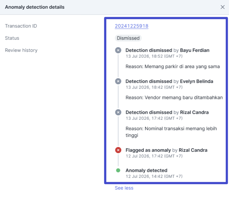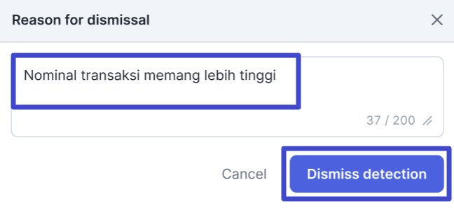 Informasi terkait transaksi yang telah dilakukan dismissed detection, beserta alasan yang diberikan, akan ditampilkan pada bagian Status.