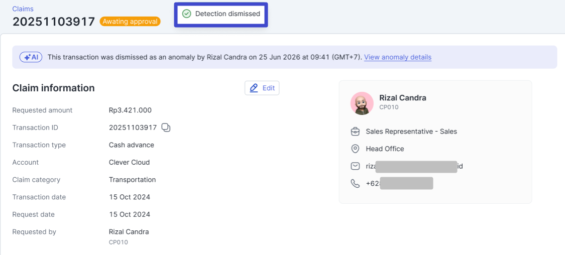 Selanjutnya apabila ternyata transaksi tersebut tidak memiliki anomali, maka Anda dapat klik “Dismiss detection”.