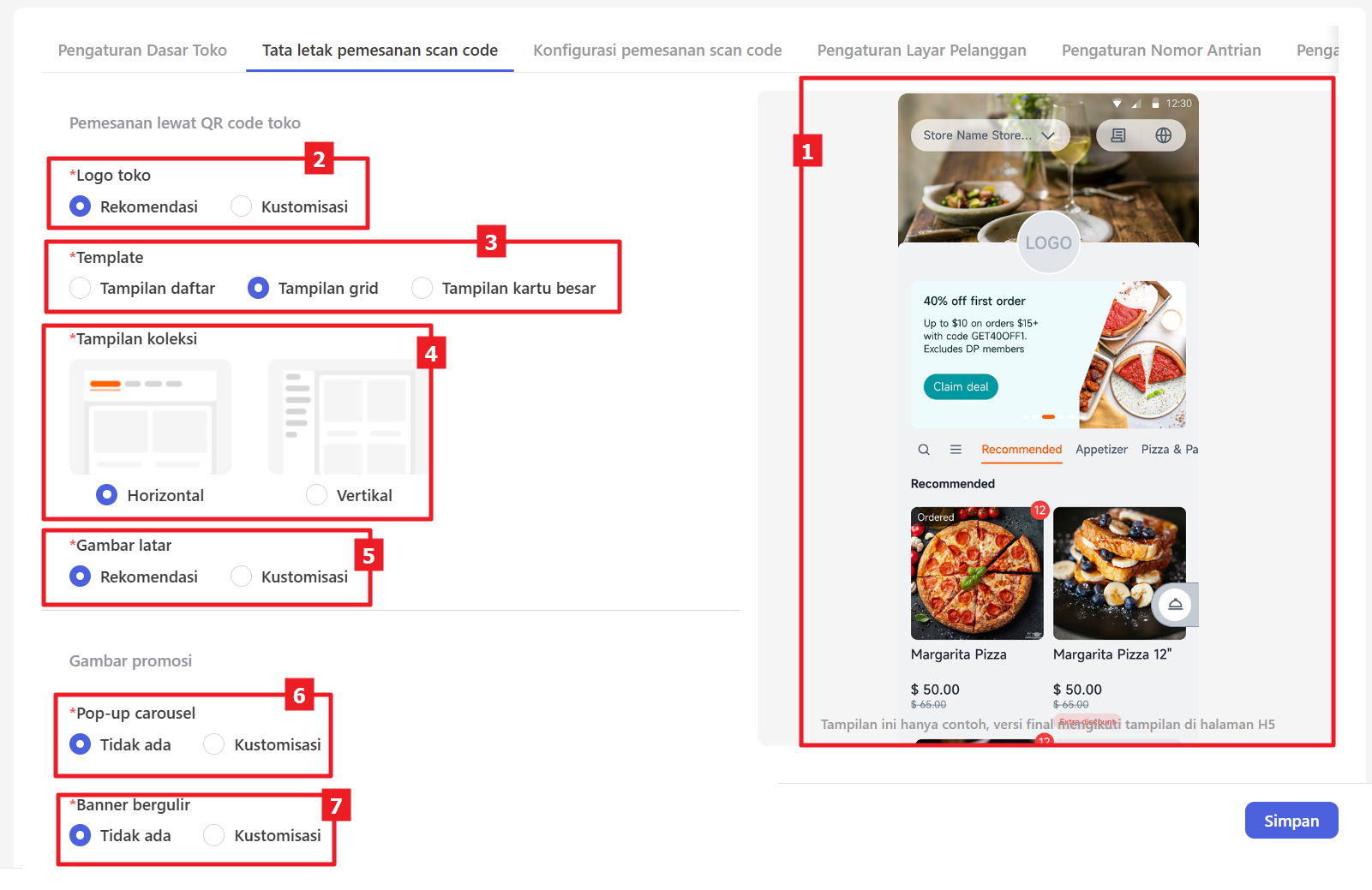Keterangan:No Kolom Penjelasan 1 Preview Pada sisi kanan Anda akan melihat tampilan/preview dari menu yang Anda kustomisasi. 2 Logo toko - Pilih Rekomendasi jika Anda ingin menggunakan logo toko default.