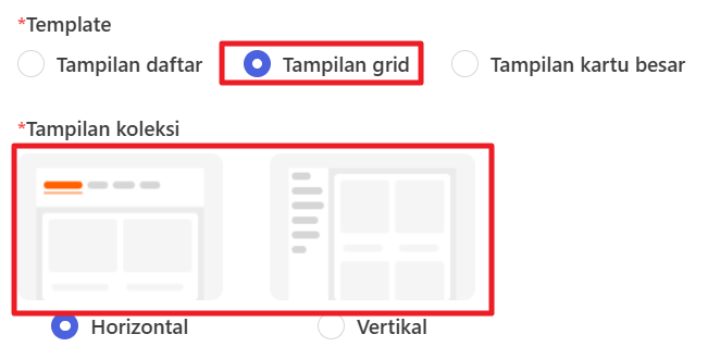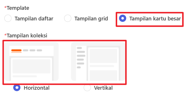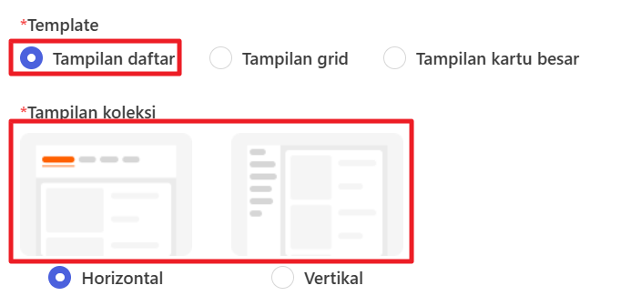4 Tampilan koleksi Pada bagian ini, Anda akan memilih tampilan dalam bentuk Horizontal atau Vertikal. Pilihan ini akan berpengaruh pada template yang Anda pilih sebelumnya. 5 Gambar latar - Pilih Rekomendasi jika Anda ingin menggunakan gambar latar default.