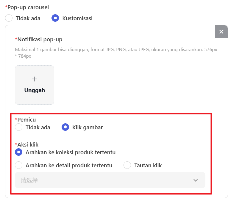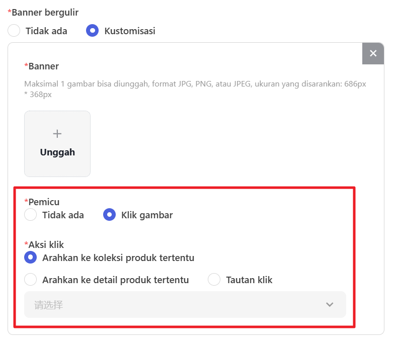 Anda juga dapat memilih Pemicu munculnya banner carousel, terdapat dua opsi Tidak ada dan Klik gambar.