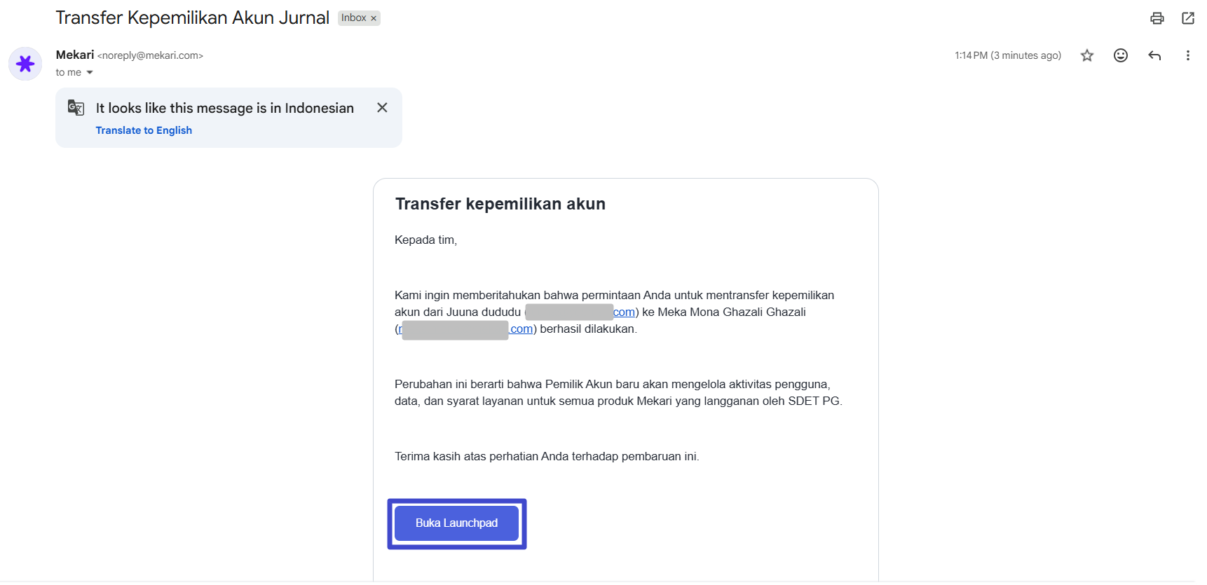 Selanjutnya, semua pengguna (pemilik akun sebelumnya dan pemilik akun baru) akan menerima notifikasi seperti berikut melalui email. Kemudian klik “Buka Launchpad” untuk melanjutkan.