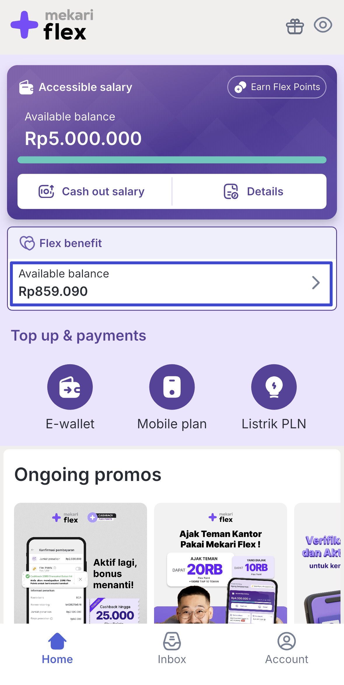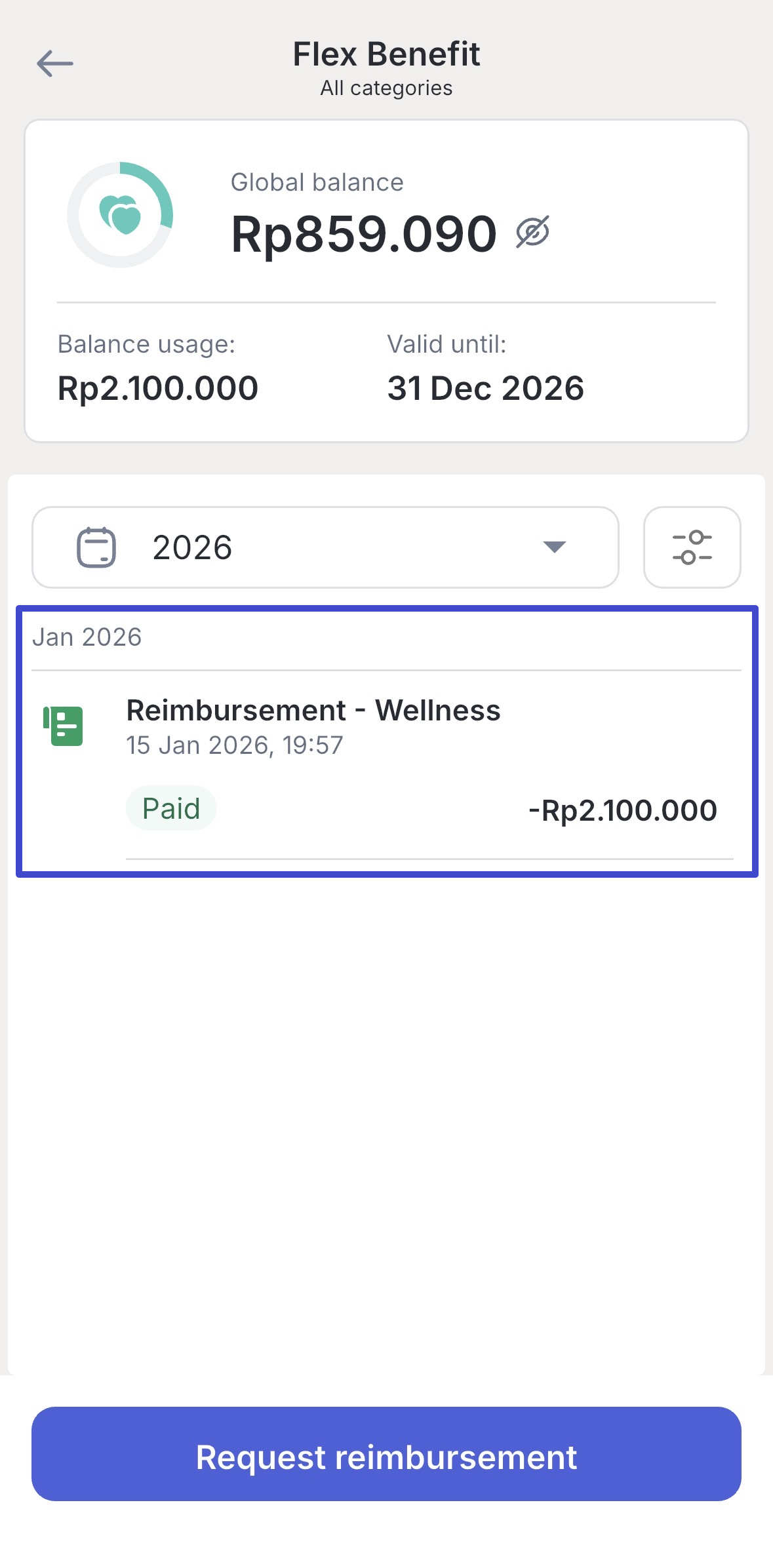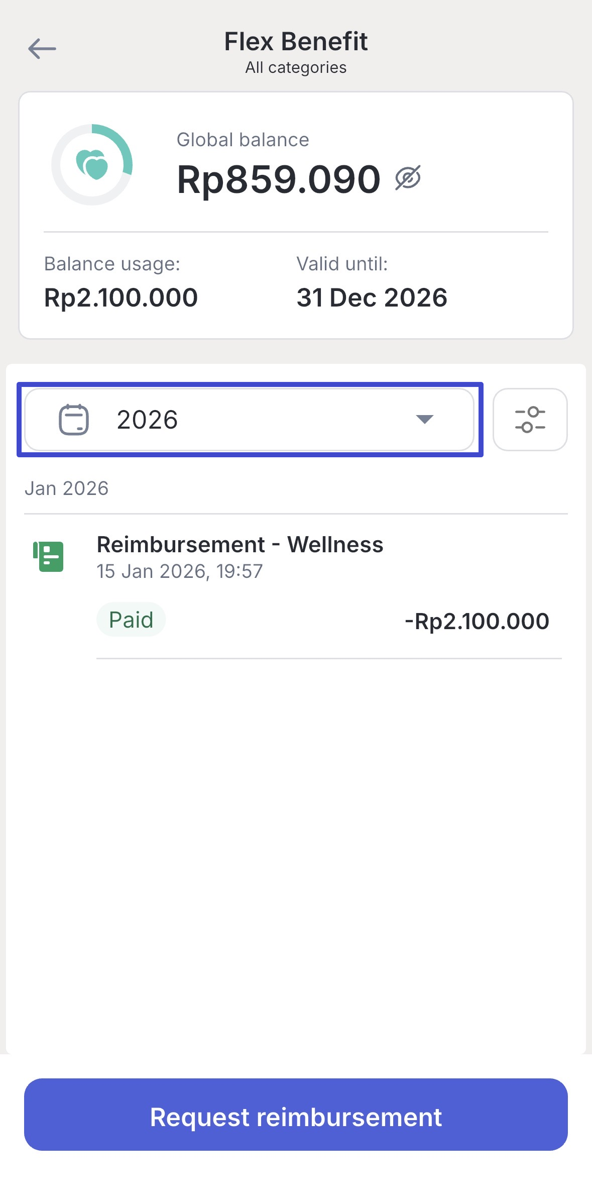 Pada halaman Home, Anda dapat melihat saldo Flex Benefit dengan klik "Available balance" pada kolom Flex Benefit.